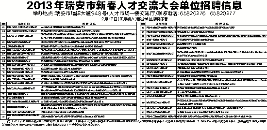 举办地点:瑞安市瑞祥大道948号(人才市场一楼交流厅)联系电话:65820276 65820277
