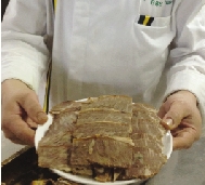 陈胜传向记者展示了一块烤熟后的牛仔骨,骨头上的血丝和肉清晰可见,且骨头上剔下来的牛肉带有白色脉络(如图)。陈胜传告诉记者,“这就是真正牛仔骨的骨头和肉。”