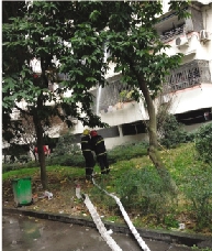 消防员查看了阳台上的火势,发现是阳台上的洗衣机、衣服和一些杂物在燃烧,火势不是很大。消防员出动水枪,很快就扑灭了火焰。