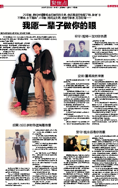 说起这20多年的爱情之路,陈光伟说:“既然作出承诺,就要信守诺言,做她一辈子的眼睛,不离不弃。”