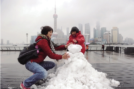 2月19日,游客在上海外滩观光平台上堆雪人。当日早晨开始,上海的降雪开始加大,并出现罕见的“雷打雪”现象。一些网友发帖称,降雪过程中听到了打雷声。上海中心气象台首席服务官傅易说,确实有,在19日早晨4时左右,他本人也“听到了”。这种“雷打雪”现象虽然较为罕见,但历史上也出现过。主要原因是,此前暖湿空气势力较强,冷空气下来的时候,产生了较强的对流天气,从而引发了雷电活动。