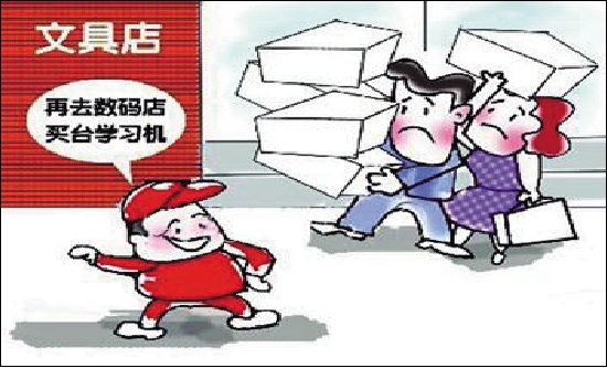 无独有偶,某高中学生家长赵女士最近也非常郁闷,“开一次学就得准备万把块钱,学费再加MP4、电子词典和手机。这还不算假期孩子出门旅行,和同学聚会的花销。”临开学,赵女士面对这笔“开学投资”显得很无奈:“现在的孩子都追求时尚,相关的‘装备’都要跟上,要不然会被同学们看不起,但家长的经济压力就来了。”