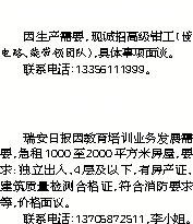 瑞安日报因教育培训业务发展需要,急租1000至2000平方米房屋,要求:独立出入、4层及以下,有房产证、建筑质量检测合格证,符合消防要求等,价格面议。