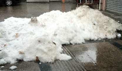 2月21日17时许,@扫黄打飞 经过市区小东门街“诚心食品商行”的店铺前,发现人行道上堆满了冰屑,宽约两间店面,最高约1.2米,现场污水横流,还散发出一股腥味(如图)。边上,一位妇女正呵斥打算玩冰的孩子:“不要到冰堆里面去,太脏了。”