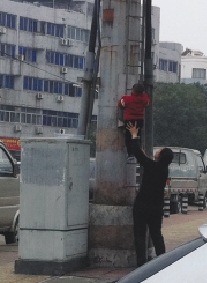 大人竟扶小孩爬电线杆