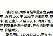 瑞安日报因教育培训业务发展需要,急租1000至2000平方米房屋,要求:独立出入、4层及以下,有房产证、建筑质量检测合格证,符合消防要求等,价格面议。