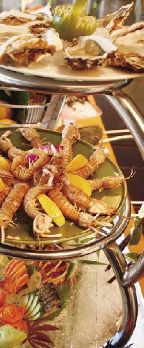 玻璃不锈钢陈列柜里是一罐罐橄榄油浸渍着的鲜红辣椒、翠色青瓜……还有各种香料和蔬果,橙黄肥美的烤鸭吊在玻璃橱里;大只肥美的蚝、甜虾、三文鱼、北极贝、白玉豚、吞拿鱼、象拔蚌,通通摆在定时更换碎冰的海鲜槽里;色泽水润橘红膏子的雪白扇贝在黝黑火山石上“哔啵”烤着,时不时有明黄微蓝火舌探出头来……如果价位更高的自助餐,现在应该来一杯红酒或香槟,欢腾的果香咕嘟咕嘟地在杯子里翻滚,这时不妨多切几片乳酪,伴着酒,是很拿腔调的食法。