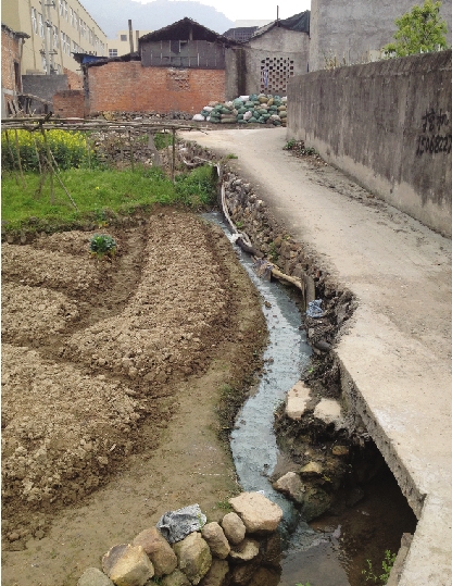 随后,记者查看了5家制革厂周边的环境,发现这5家制革厂围墙一侧的农田边,有一条“迷你蓝色多瑙河”(小水沟,见上图),经由制革厂区内流出的“蓝水”,正不断地通过这条小水沟,汇入村内小河,最终流入飞云江。