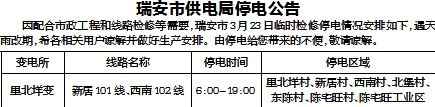 因配合市政工程和线路检修等需要,瑞安市3月23日临时检修停电情况安排如下,遇天雨改期,希各相关用户谅解并做好生产安排。由停电给您带来的不便,敬请谅解。