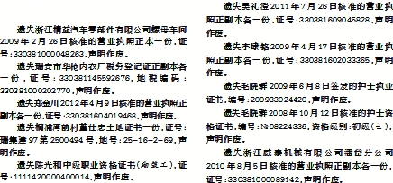 遗失郑金川2012年4月9日核准的营业执照正副本各一份,证号:330381604019468,声明作废。