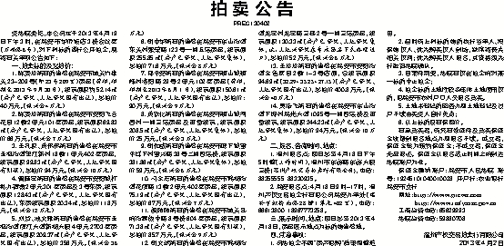 受法院委托,本公司定于2013年4月19日下午3时,在瑞安市华侨饭店3楼会议室(万松路6号),对下列标的进行公开拍卖,现将有关事项公告如下: