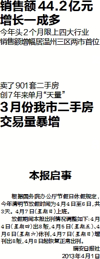 放假期间本报出刊情况调整如下:4月4日(星期四)出8版,4月5日(星期五)、4月6日(星期六)休刊,4月7日(星期日)增刊出8版,4月8日起恢复正常出刊。