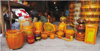 摊位上的这些圆木,哪几件是婚嫁必备的呢?严朝火向记者介绍,圆木“家生”品种丰富,有几十种之多,即使同一个品种又分大小不同,不过一套圆木嫁妆必不可少的有5件,分别是鹅兜、马桶、茶盘、锦格儿、鞋佬,每件可大可小。六七十年代那会儿结婚,家庭经济条件好的件数多一些,条件一般的则少一些,如今做这样5件套价格大约在600至800元。