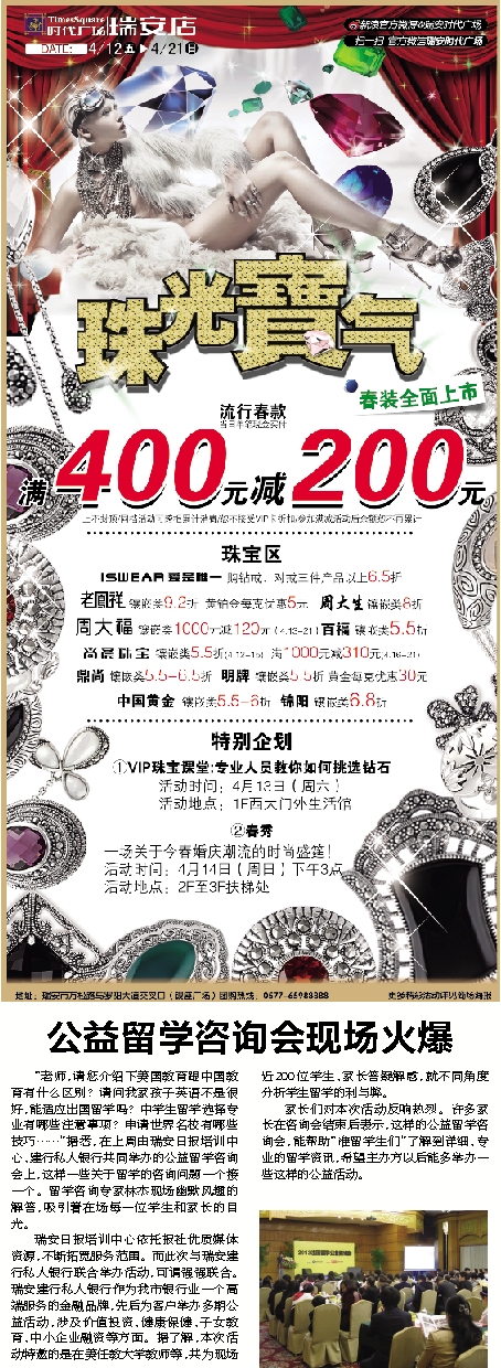 瑞安日报培训中心依托报社优质媒体资源,不断拓宽服务范围。而此次与瑞安建行私人银行联合举办活动,可谓强强联合。瑞安建行私人银行作为我市银行业一个高端服务的金融品牌,先后为客户举办多期公益活动,涉及价值投资、健康保健、子女教育、中小企业融资等方面。据了解,本次活动特邀的是在美任教大学教师等,共为现场近200位学生、家长答疑解惑,就不同角度分析学生留学的利与弊。