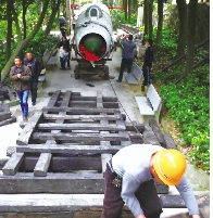 接下来,他们要为今天的搬运做准备。据了解,他们需搭一些枕木,将飞机“举高”,才能将飞机顺利运送上去。这里也将是这次“歼8”上西山所面临的第二个大难度的地方。本报记者将继续跟踪报道。