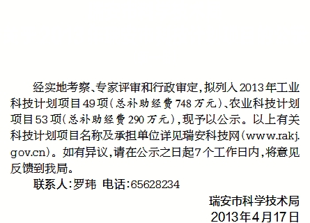 经实地考察、专家评审和行政审定,拟列入2013年工业科技计划项目49项(总补助经费748万元)、农业科技计划项目53项(总补助经费290万元),现予以公示。以上有关科技计划项目名称及承担单位详见瑞安科技网(www.rakj.gov.cn)。如有异议,请在公示之日起7个工作日内,将意见反馈到我局。