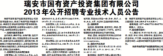 瑞安市国有资产投资集团有限公司系国有独资企业,承担了瑞安市政府融资平台、基建项目建设和国有资产管理等职能,现因事业发展需要,拟招聘专业技术人员若干名,现将有关事项公告如下: