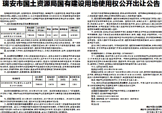 十三、本次公开出让的详细资料及具体要求,见出让文件。申请人须于2013年5月6日16时前到瑞安市公共资源交易中心获取本次出让文件。