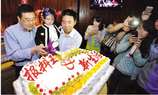 派对现场,网友@俏俏小开心 带着自己3岁的女儿俏俏来到现场,原来俏俏的生日和@瑞安日报—报料王 是同一天。当《生日快乐》歌响起时,在全场网友的共同祝福下,市委宣传部副部长周小勇和本报副总编陈增童抱着俏俏一起切开了60寸的生日蛋糕,在场所有来宾都分享了生日的甜蜜。