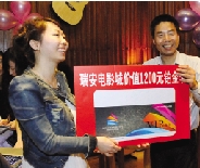 活动中,另外3个大奖,分别由市委宣传部副部长周小勇、瑞安电影城工作人员李斌和“爱上fall in love音乐酒吧”经理张竹欣抽取。网友@最爱鱼头、@诸葛金城 和@米匪徒本尊 均幸运地获得了一张电影铂金卡。