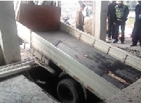 驾驶员刘某说,当时正运瓷砖到一户人家,倒车时只听“哗啦”一声,车后轮就陷到了地下室。估计是该户人家地面的水泥板老化,经受不住货车的重量。