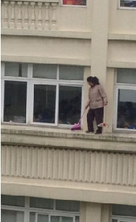 5月6日,@學銘手端帅锅爆炒_04x 将一张图片发到微博上,引来众多网友关注。从照片中可看到,清洁阿姨没有采用任何安全防护措施,微胖的身躯紧贴墙壁,看着让人心惊肉跳(如图)。@ 张儒亿 说,清洁阿姨飞檐走壁打扫垃圾是对工作的负责,为校园清洁做出不可磨灭的贡献,这是用生命捍卫校园卫生!