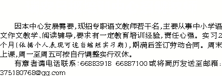因本中心发展需要,现招专职语文教师若干名,主要从事中小学语文作文教学、阅读辅导,要求有一定教育培训经验,责任心强。实习2个月(依据个人表现可适当缩短实习期),期满后签订劳动合同。周末上课,周一至周五可按自行调整实行双休。