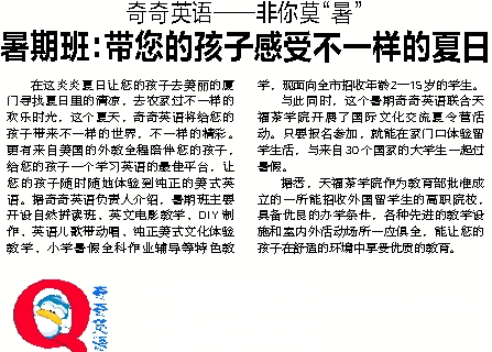 在这炎炎夏日让您的孩子去美丽的厦门寻找夏日里的清凉,去农家过不一样的欢乐时光,这个夏天,奇奇英语将给您的孩子带来不一样的世界,不一样的精彩。更有来自美国的外教全程陪伴您的孩子,给您的孩子一个学习英语的最佳平台,让您的孩子随时随地体验到纯正的美式英语。据奇奇英语负责人介绍,暑期班主要开设自然拼读班、英文电影教学、DIY制作、英语儿歌带动唱、纯正美式文化体验教学、小学暑假全科作业辅导等特色教学,现面向全市招收年龄2—15岁的学生。