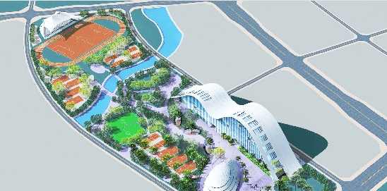 河流西侧为二期工程,包括400米跑道标准田径运动场(内置足球场),室外篮球场、室外网球场,配套看台。沿河从南到北依次为网球场、篮球场,中间为400米跑道标准田径场(内置足球场),田径场西侧为配套看台及体育馆。同时,在场馆、室外健身场所四周布置绿化用地,沿河布置休闲绿化带。