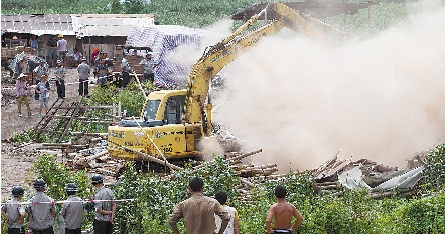 本报讯(首席记者 严小章/文 记者 孙凛/图)轰隆、轰隆……随着一声声巨响,违法建筑应声倒下。昨日,陶山镇联合镇城建办、国土资源、住建、环保、电力等相关职能部门,组织近100人,依法打击取缔飞云江金潮港段的8个非法加工场点,拆除违建约4600平方米。