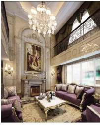 选材:欧式大型灯池、精美大理石、落地玻璃及精致窗帘、欧式家具、欧式油画及壁炉、壁灯等。