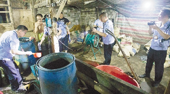 22时20分,执法人员来到南河村一非法电镀加工点,该加工点由一间木质老房改造而成,加工点里面共有3名工人在操作。其中一工人表示,他们从19时起开始工作至24时结束。该加工点散发出的化学用品气味刺鼻,执法人员立即要求工人停止施工并予以断电。记者发现该加工点地面被挖了一个0.5米长宽的洞,将未经任何处理的工业废水通过管道直接排入该洞口下的蓄水池,等蓄水池满了使用抽水泵将水抽起通过管道排到厕所。找到排污口后,执法人员立即取水样带回检测。