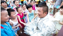 7月28日,市筝韵艺校的50多位师生走进市消防大队,与消防队员们提前庆祝八一建军节。在现场,小朋友们表演的《情满灾区,爱满人间》、《赞消防》、《救火》等节目把联谊会推向高潮。不少小朋友纷纷向消防官兵献上亲手制作的礼物。图为消防战士向小朋友展示消防特种服装。