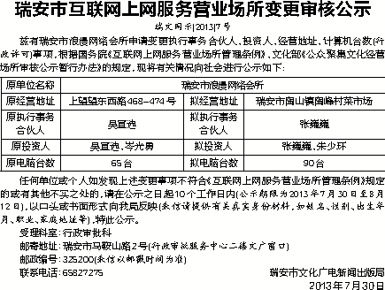 瑞安市互联网上网服务营业场所变更审核公示