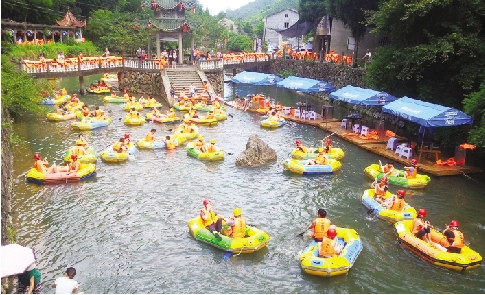 昨日下午16时许,位于湖岭镇直干村的巾仙溪天然游泳池内,游客如织。男人们钻进水里游泳,女人们则坐在竹筏上泼着水,玩得不亦乐乎。