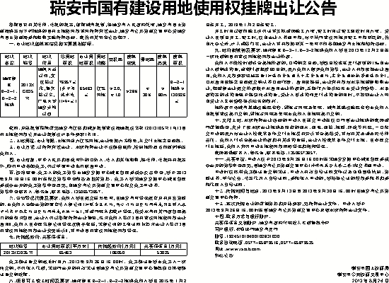 十二、挂牌时间与地点:2013年9月13日至2013年9月30日16:00时在瑞安市公共资源交易中心挂牌。