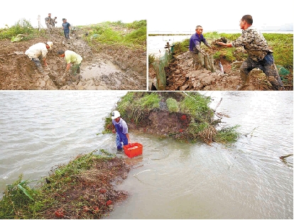 昨日,我市飞云江沿岸的水产养殖户在修复水毁鱼塘。受台风“潭美”带来的“风、暴、潮”相碰头影响,飞云江沿岸的水产养殖鱼塘被潮水倒灌,千多亩正值生长期的虾、文蛤和青蟹等被冲出鱼塘,据初步统计,养殖户损失约1600万元。面对自然灾害,水产养殖户纷纷开展生产自救,减少损失,及早恢复生产。