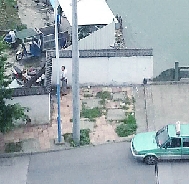 照片是从居民楼由上往下拍摄的,不长的一座桥两端,均砌有围墙,桥梁两端各停放着一辆出租车,两名穿着红色上衣的出租车司机在墙角处小便。