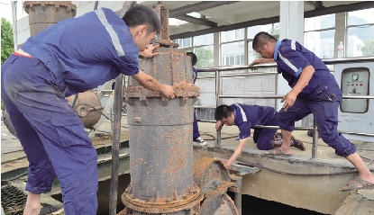 这是水务人员抢修江北水厂的一幕。虽然从10月8日中午开始,江北水厂即恢复生产,但4台取水泵、6台送水泵均仅能运行1台,日供水总量仅10万吨(含江南水厂3万吨),仅是正常供水量的65%左右。加上恢复供水后,低层用户的集中用水及贮水,导致供水管网压力无法均衡,2层以上用户仍不能用水。为保障城市安全供水,水务人员夜以继日奋战在供水抢修一线。有的抢修工连续抢修三天三夜,靠不停地打自己的脸把自己打醒,投入抢修工作;有的过度劳累,呕吐不止,被强行送回家休息,但次日凌晨又出现在厂里;有的对食物过敏,体力透支,几近虚脱,仍坚守在修理岗位;有的连饭都顾不上吃,连水也顾不上喝,脚起泡、脱皮,仍然冲在抢修一线……