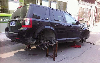 昨日微信网友“张金国”报料称,他的路虎车,一夜之间被偷去了4个车轮胎(如图),停在大街上动弹不得。