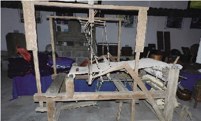 织布机:土法织布也有一台机器,木头制作,有机架,筘、卷经线的轴头,卷布的横轴,还有一对踏脚板。