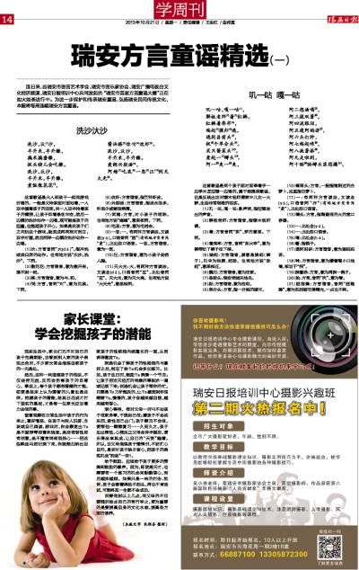 连日来,由瑞安市语言艺术学会、瑞安市音乐家协会、瑞安广播电视台文化经济频道、瑞安日报培训中心共同发起的 “瑞安市首届方言童谣大赛”正在如火如荼进行中。为进一步保护和传承瑞安童谣,弘扬瑞安民间传统文化,本报将每周连载瑞安方言童谣。