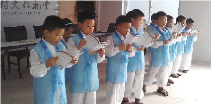 在开蒙礼仪上,该村13位年满7岁的小朋友,在村干部和老师的带领下,按正衣冠、行拜师礼、朱砂启志、指聪点明、开笔启蒙和分发智慧笔6个环节,顺利完成了人生最重要的启蒙仪式。