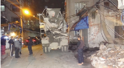 搅拌车进弄堂电线缠身难动弹