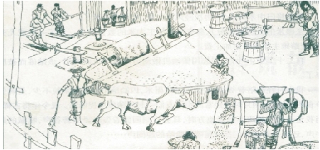 踏碓的步骤是,首先将晒干的稻谷拨入谷砻里,用人工推磨的方法使谷壳和米粒分离,将砻好的粗米拨到碾坦上进行细加工,将碾好的米拨下放在风车里,摇动风车,谷壳和米糠各自分道走了,白米流到下面的竹箩中来了。再将箩中米用米筛进行一番旋转筛选,纯米落在地上,米筛中还残留部分未碾好的谷粒。这部分谷粒须放在捣臼内再加工。如果部分农户人口少只碾几十斤谷子,即不需在碾盘上加工,在臼中加工即成了。最后将臼中米捣出来,再次经风车去糠、壳,即成白米。