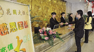 这两天,不少市民都收到来自我市一高端餐饮酒店的促销短信:11月20日至12月30日,花园大酒店惊喜大优惠。每天推出多款特价菜,啤酒买一送一,点菜中午8折、晚上8.5折,办理充值卡优惠1000元送200元,2000元送400元。“以前从没看到酒店发促销信息的,看来这次活动挺大。”一市民感叹说。