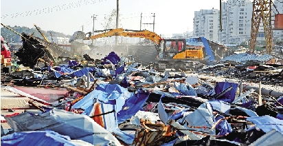 昨天,锦湖、东山、莘塍街道同时吹响拆违冲锋号,“三改一拆”行动势如破竹地展开。图为东山街道上埠村拆违现场。 (见习记者 陈立波)