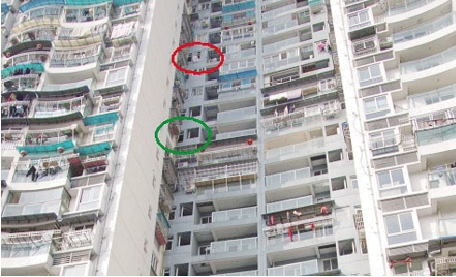 红圈为死者坠楼的位置,绿圈为尸体发现的位置