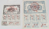 再看叁圆(还有壹圆、伍角)的中华苏维埃共和国经济建设公债:右边印“本公债周年利息伍厘,于每年十月一日付息”,左边印“本公债一九三六(笔者按:应为四,疑印错了)年十月起分五年还本”。签署:主席毛泽东,国民经济人民委员林伯渠(章)、财政人民委员邓子恢(章)。下附印五期付息票:如“经济建设公债第一期息票,凭票于一九三四年十月一日领取,息银壹角五分。财政人民委员邓子恢(章)”。