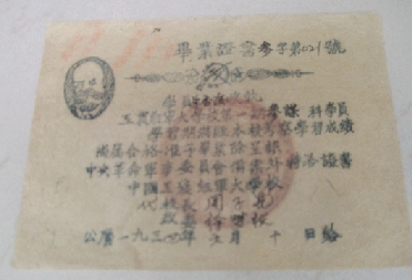 毕业证书 参字第021号(笔者按:参指大学的参谋专业)